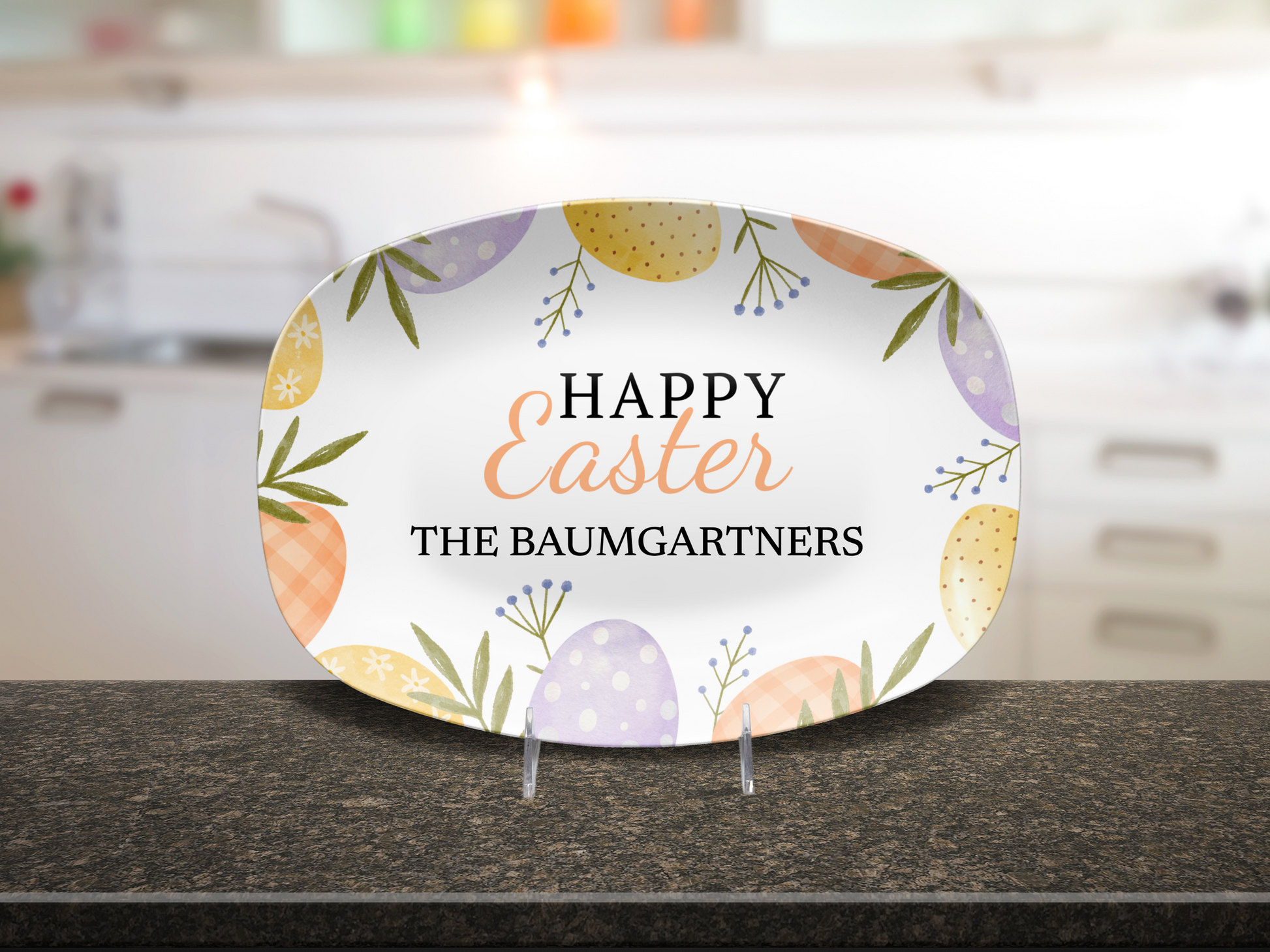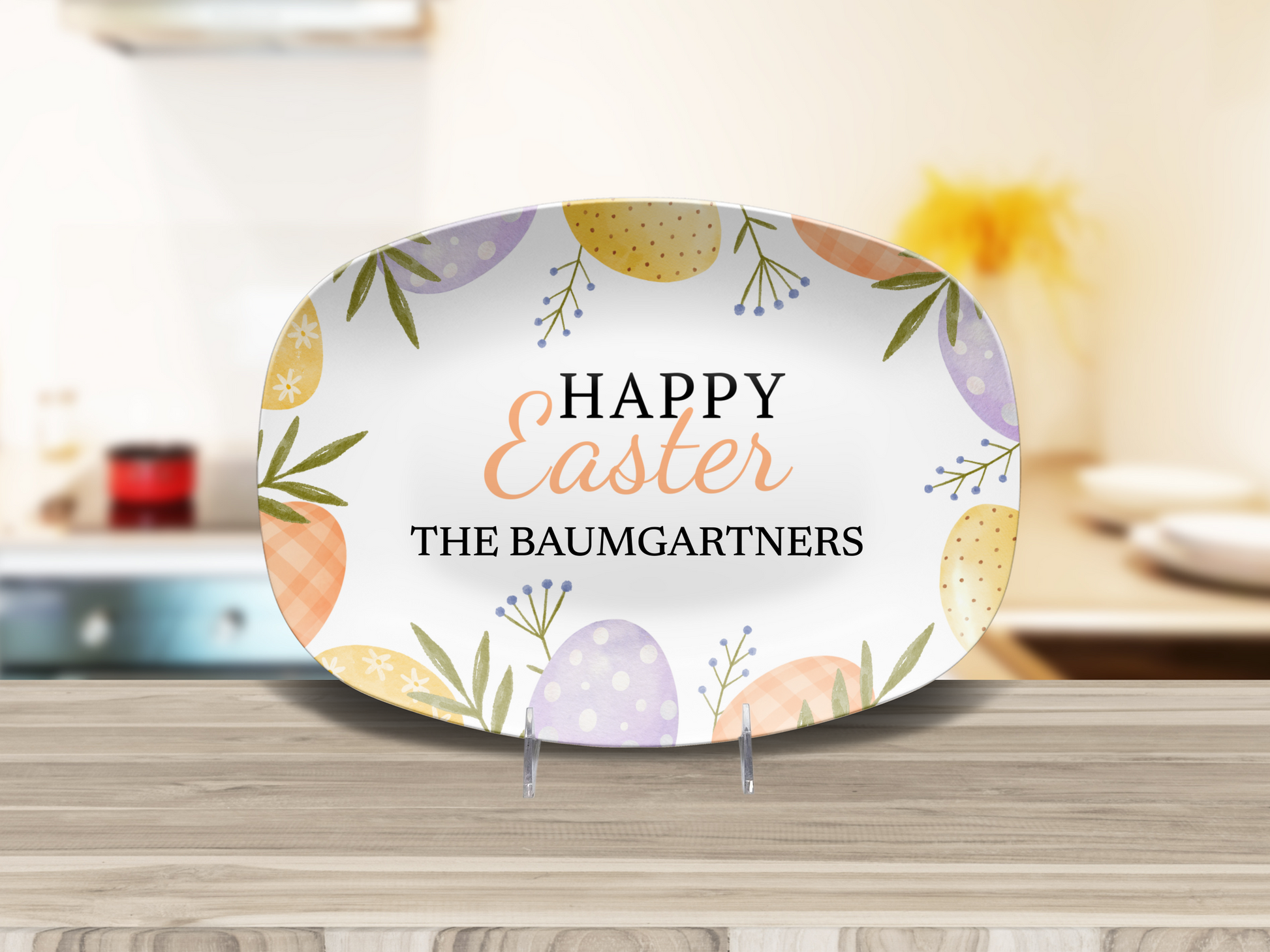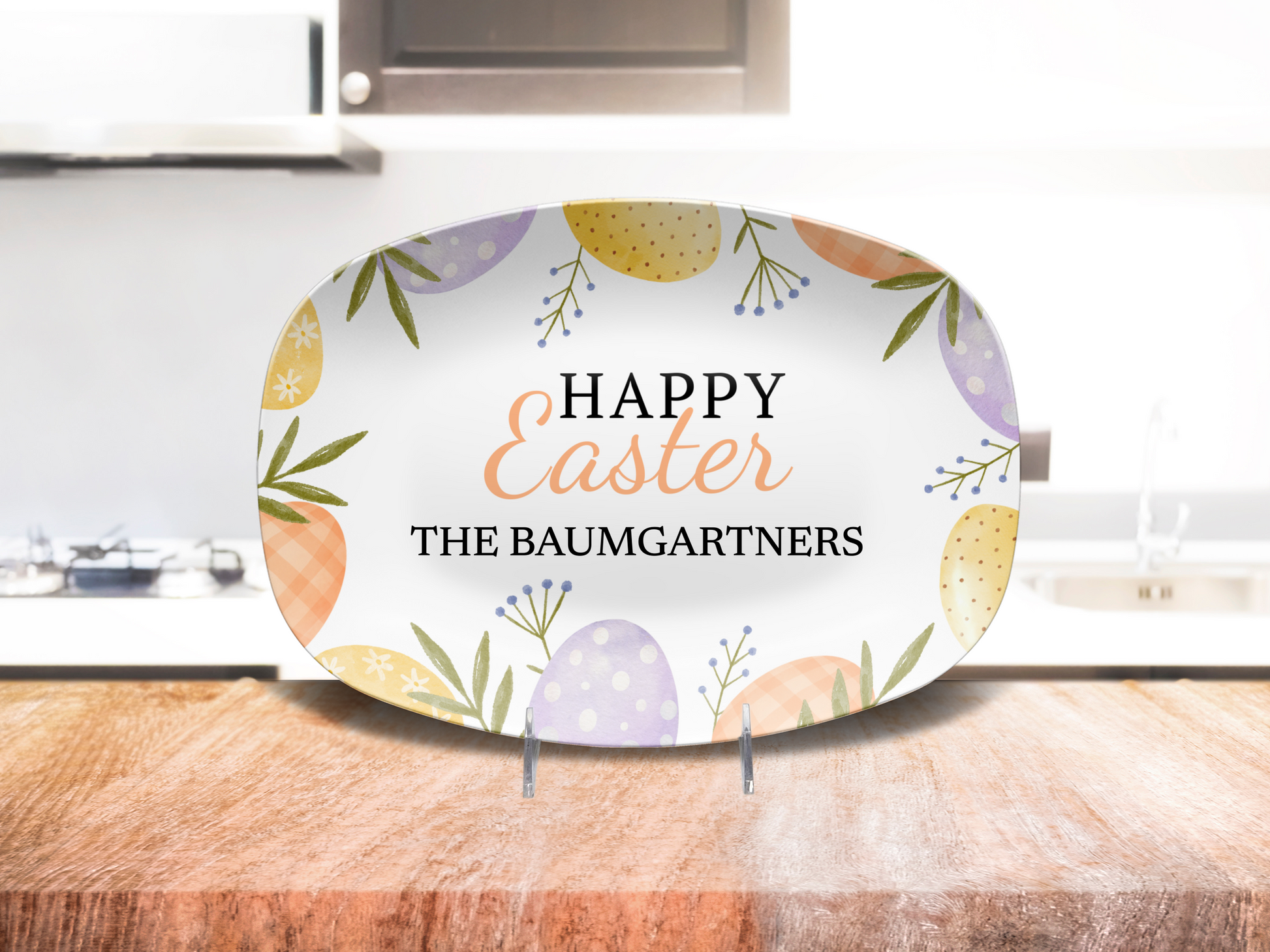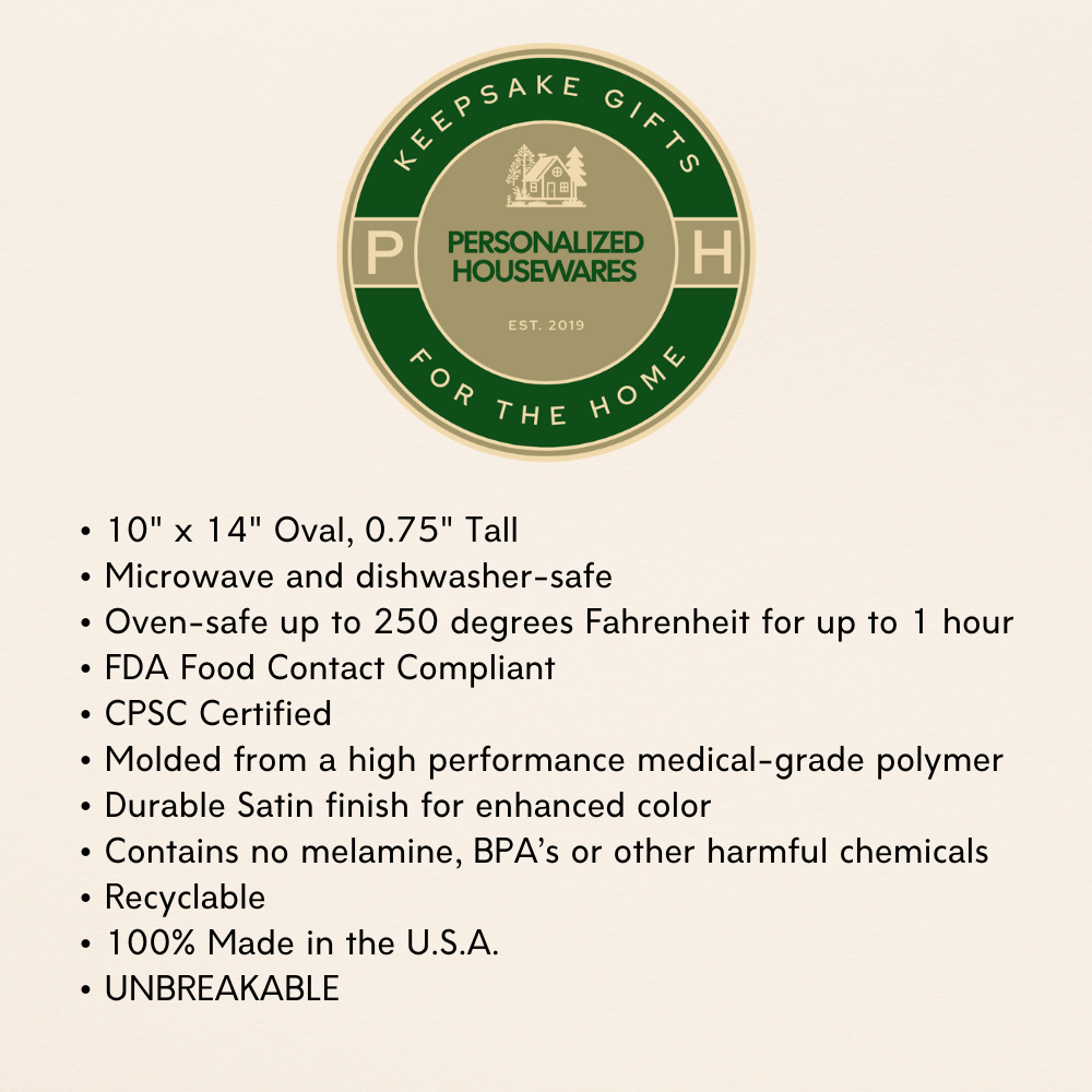 Whether you're hosting a family BBQ or a holiday dinner or want a beautiful centerpiece, our Personalized Family Name Serving Platter is the perfect choice! This elegant 10" x 14" oval platter combines function and style, making it an ideal addition to any gathering.